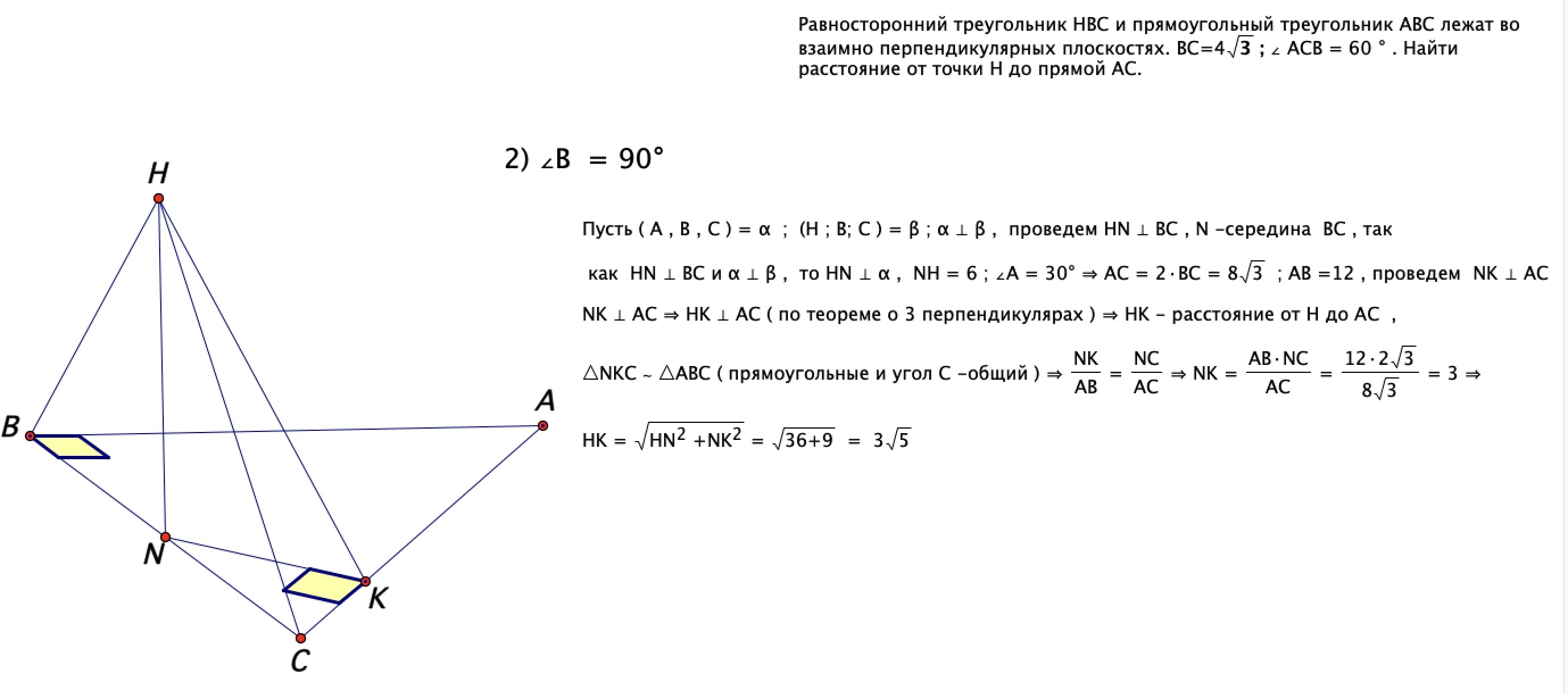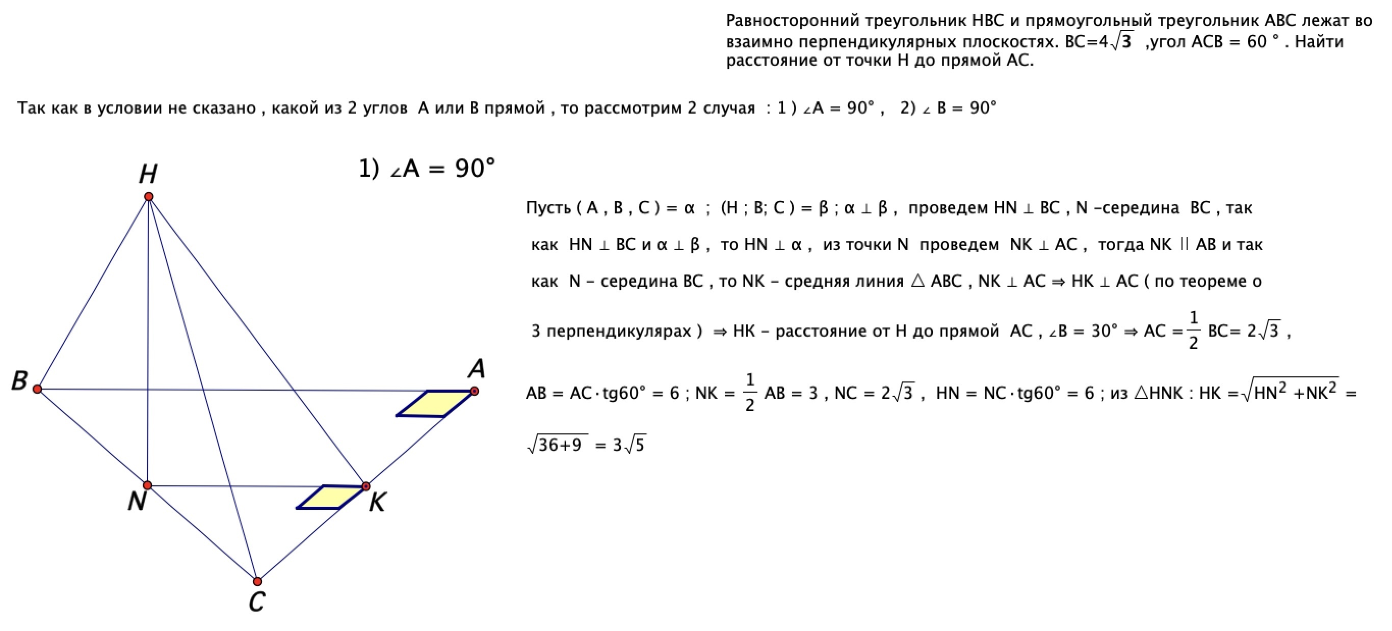 Равносторонний треугольник НВС и прямоугольный треугольник АВС лежат во взаимно перпендикулярных плоскостях.ВС=4 корня из 3 ,угол АСВ = 60 градусов .Найти расстояние от точки Н до прямой АС.