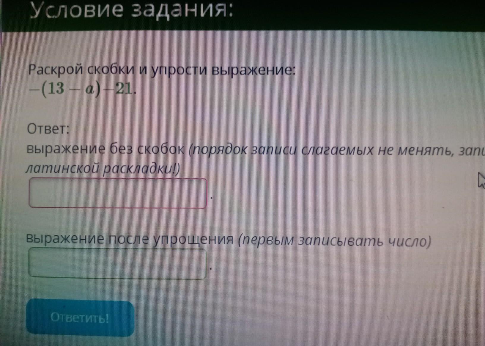 - ( 13 - а ) - 21 = - 13 + a - 21 = a - 34 .