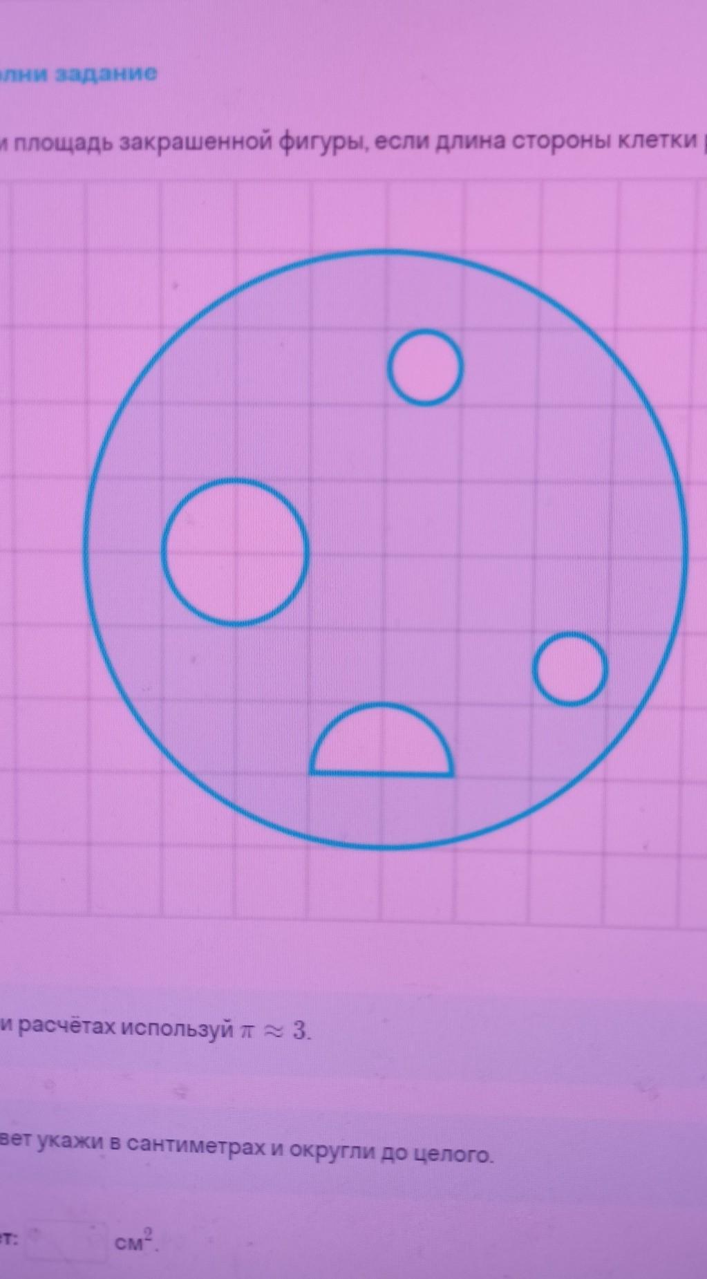 Найди площадь закрашенной фигуры, если длина стороны клетки равна 1 см. О О) O При расчетах используйлаг 3 Ответ укажи в сантиметрах и округли до целого. Ответ?