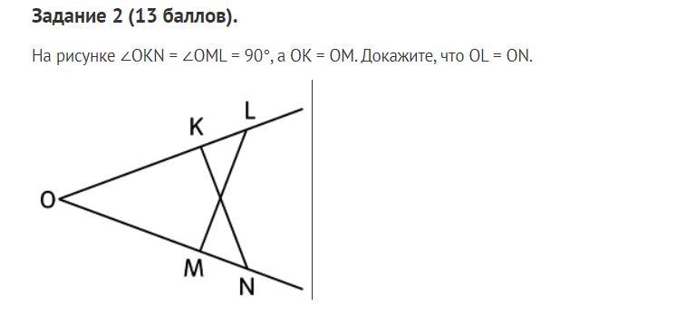 На рисунке ∠OKN = ∠OML = 90°, а OK = OM. Докажите, что OL = ON.