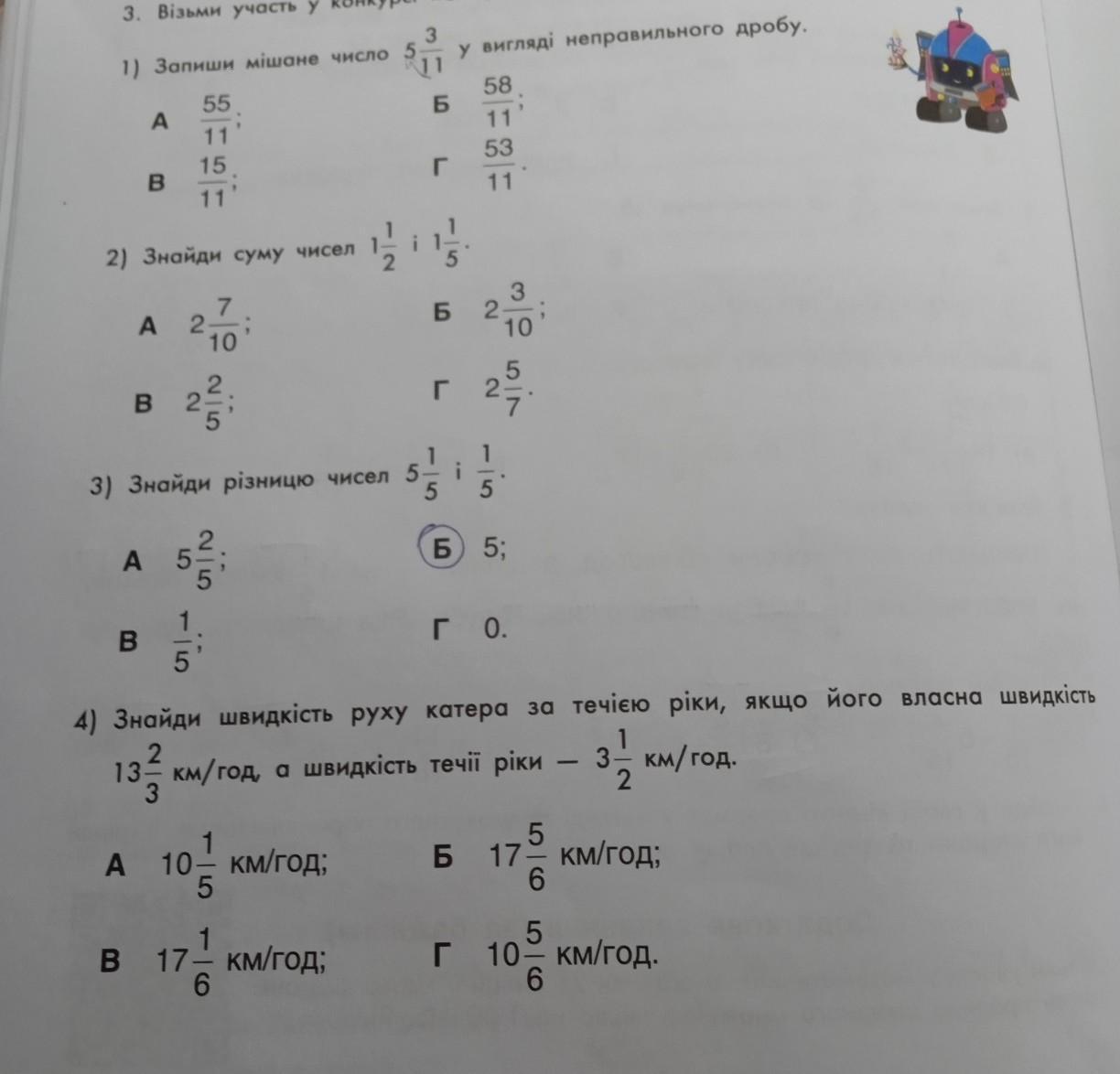 3) 5 цілі 1\5+1\5=26\5+1\5=(26*1+1*1)\5=(26+1)\5=27\5= 5 ціле 2\5