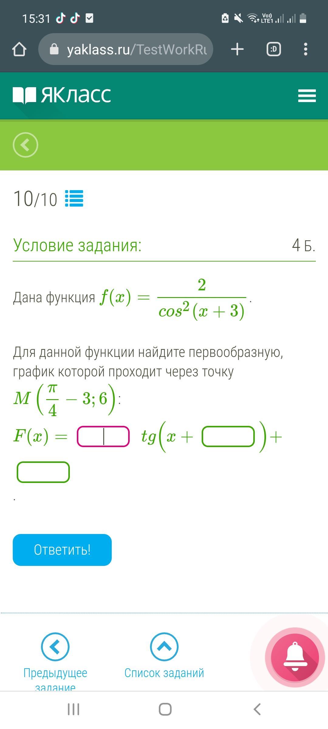 Для данной функции найдите первообразную, график которой проходит через точку М (π/4-3;6).
