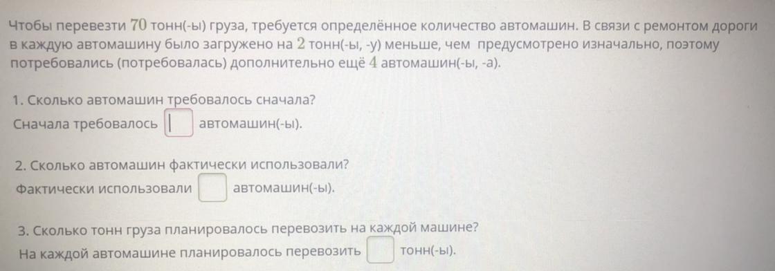 Чтобы перевезти 70 тонн(-ы) груза, требуется определённое количество автомашин. В связи с ремонтом дороги