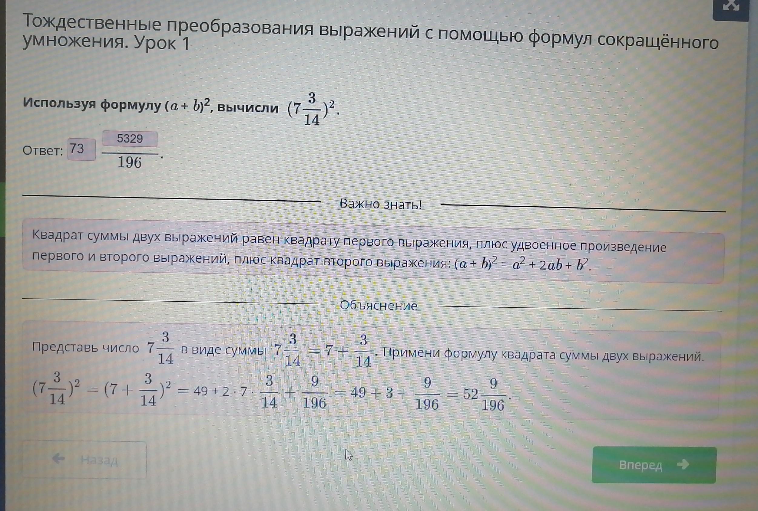 Тебе нужно просо в квадрат возвести???Тогда будет (73/14)²=5329/196 Только это не по формуле....или я чего-то не поняла?