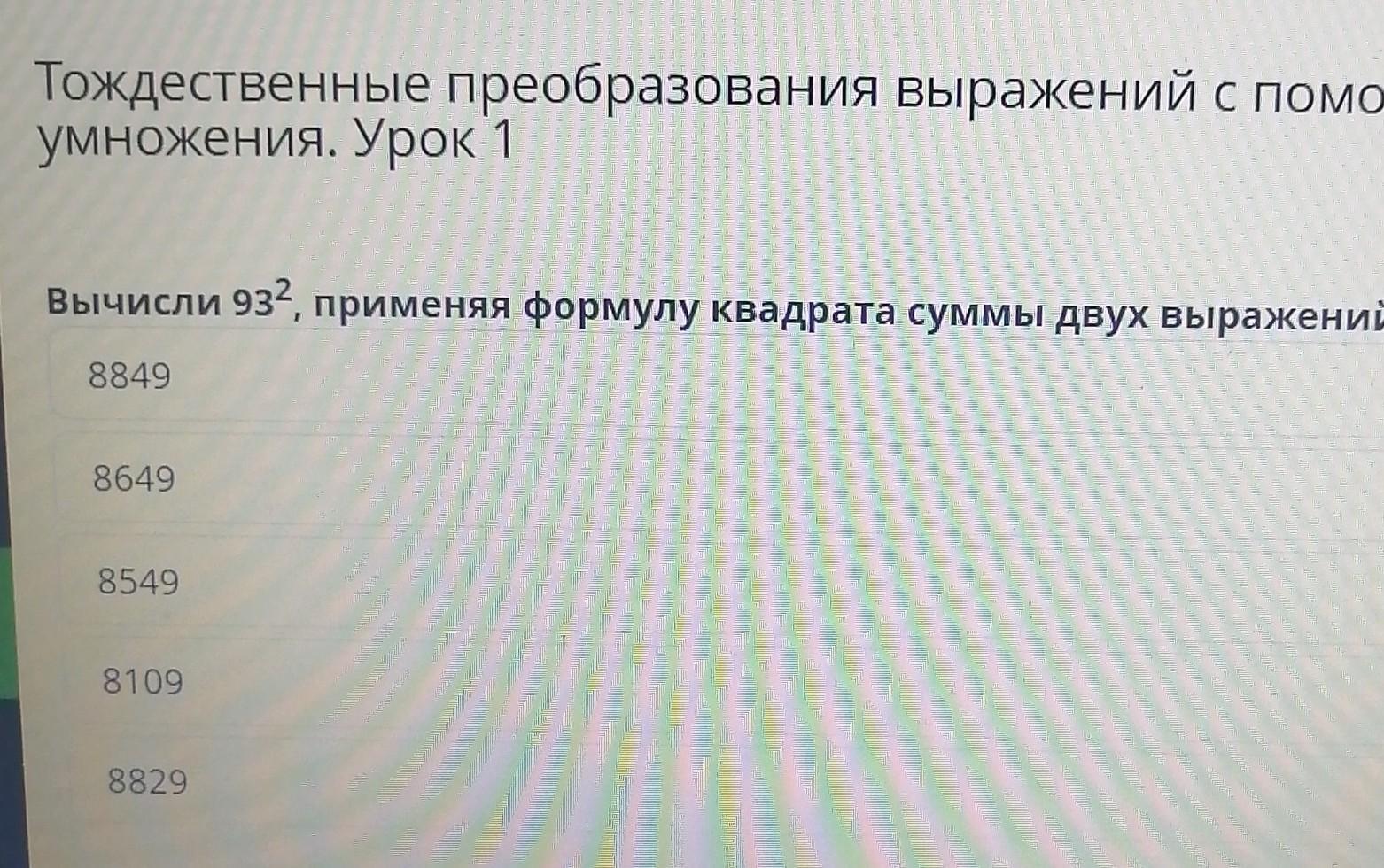 Тождественные преобразования выражений с помощью формул сокращё умножения. Урок 1 Вычисли 932, применяя формулу квадрата суммы двух выражений. 8849 8649 8549 8109 8829