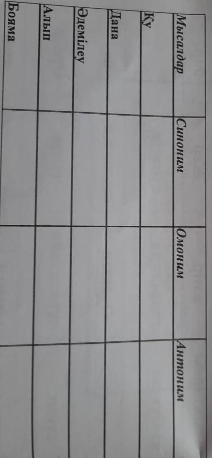 тапсырма . Кестедегі сөздердің синоним , қатарларын табыңыз . Кажеттi сөздер : данышпан , акылгой , корікті , ажарлы , зор , биiк жасанды , жалган , омiрiк , айлакер , құрғақ , бірдецкені үркіту , аңқау әшекейлеу , сымбатты , затты сырлау , бояу , нагыз , шын , орасан , ада есiмi , затты алу , құрту , бұзу , кішкентай , заммын саны , акылды ақымақ