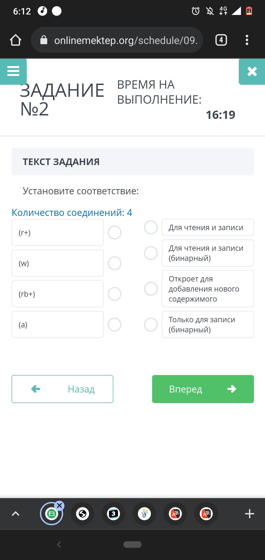 ТЕКСТ ЗАДАНИЯУстановите соответствие:Количество соединений: 4(r+)(w)(rb+)(a)Для чтения и записиДля чтения и записи (бинарный)Откроет для добавления нового содержимогоТолько для записи (бинарный)НазадВперед