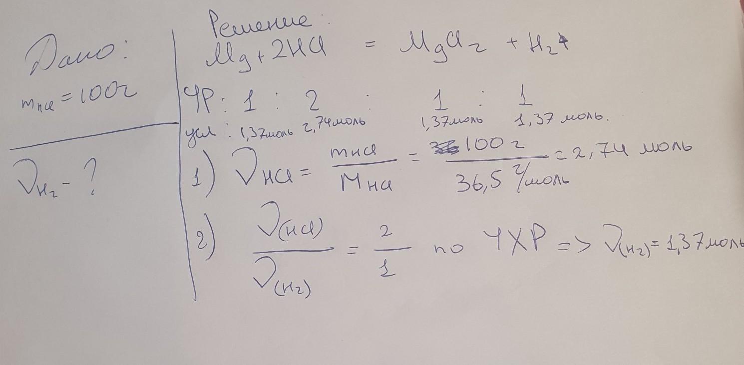 определить сколько выделилось водорода если в реакцию с магнием вступило 100 гр соляной кислоты