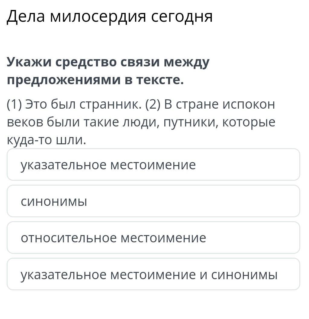 Дела милосердия сегодня Укажи средство связи между предложениями в тексте. (1) Это был странник. (2) В стране испокон веков были такие люди, путники, которые куда-то шли. синонимы указательное местоимение указательное местоимение и синонимы относительное местоимение