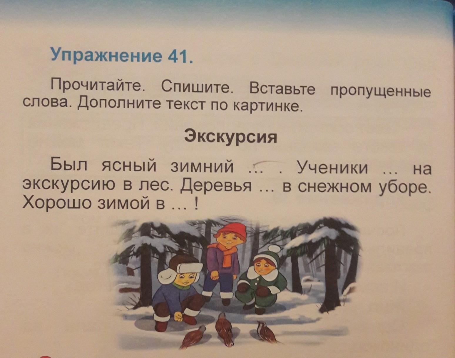 Прочитайте. Спишите. Вставьте пропущенные слова. Дополните текст по картинке. Экскурсия Был ясный зимний ... . Ученики ... на экскурсию в лес. Деревья ... в снежном уборе. Хорошо зимой в ... !