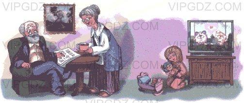 Пожилой Дедушка отложил гозету и посмотрел на свою жену. Жена предложила ему выпить чашечку чая. Дедушка расположился на кресле и приступил пить чашечку чая.Внучка уложила свою куклу спать. По телевизору шёл весёлый мультик смешарики которую любила девочка она пологала что успеет его посмотреть.