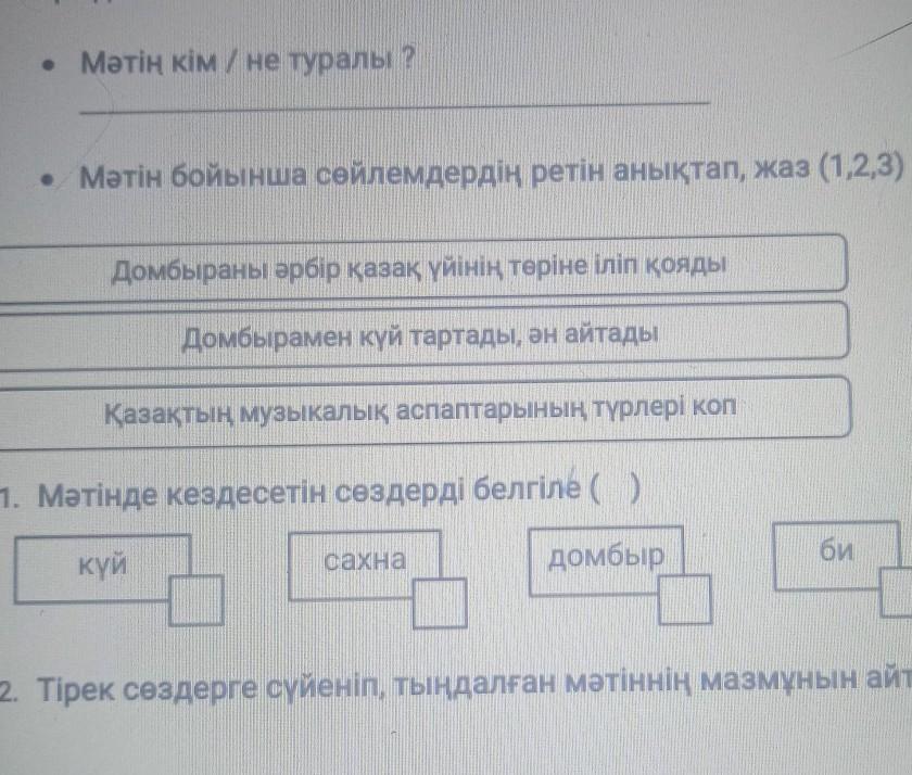 1. Мәтінді тыңда. Тапсырмаларды орында, Қазақтың музыкалық аспаптарының түрлері өте көп. Ата - бабаларымыз оларды ағаштан, темірден, малдың сүйегінен жасаған. Еліміздің әртүрлі музейлерінде 400 ден астам коне музыкалық аспаптары сақтаулы. Олар: домбыра, қобыз, сырнай және тағы басқа аспаптар бар Домбырамен күй тартады, ән айтады. Қазақ халқының атақты күйшілері Құрманғазы, Дәулеткерей, Дина өздерінің күйлерін осы домбырамен шығарған. Біздің заманымызға қазақ халқының ән-күйлері, жырлары домбыра арқылы жеткен. Домбыраны әрбір қазақ үйінің төріне іліп қояды.