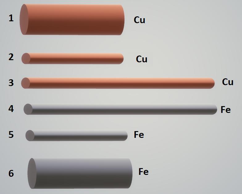 Имеется шесть проводников, изготовленных из различных материалов и имеющих различные размеры. Удельные сопротивления меди и железа равны pм = 0.017 Ом·мм²/м и рж = 0,1 Ом·мм²/м соответственно.