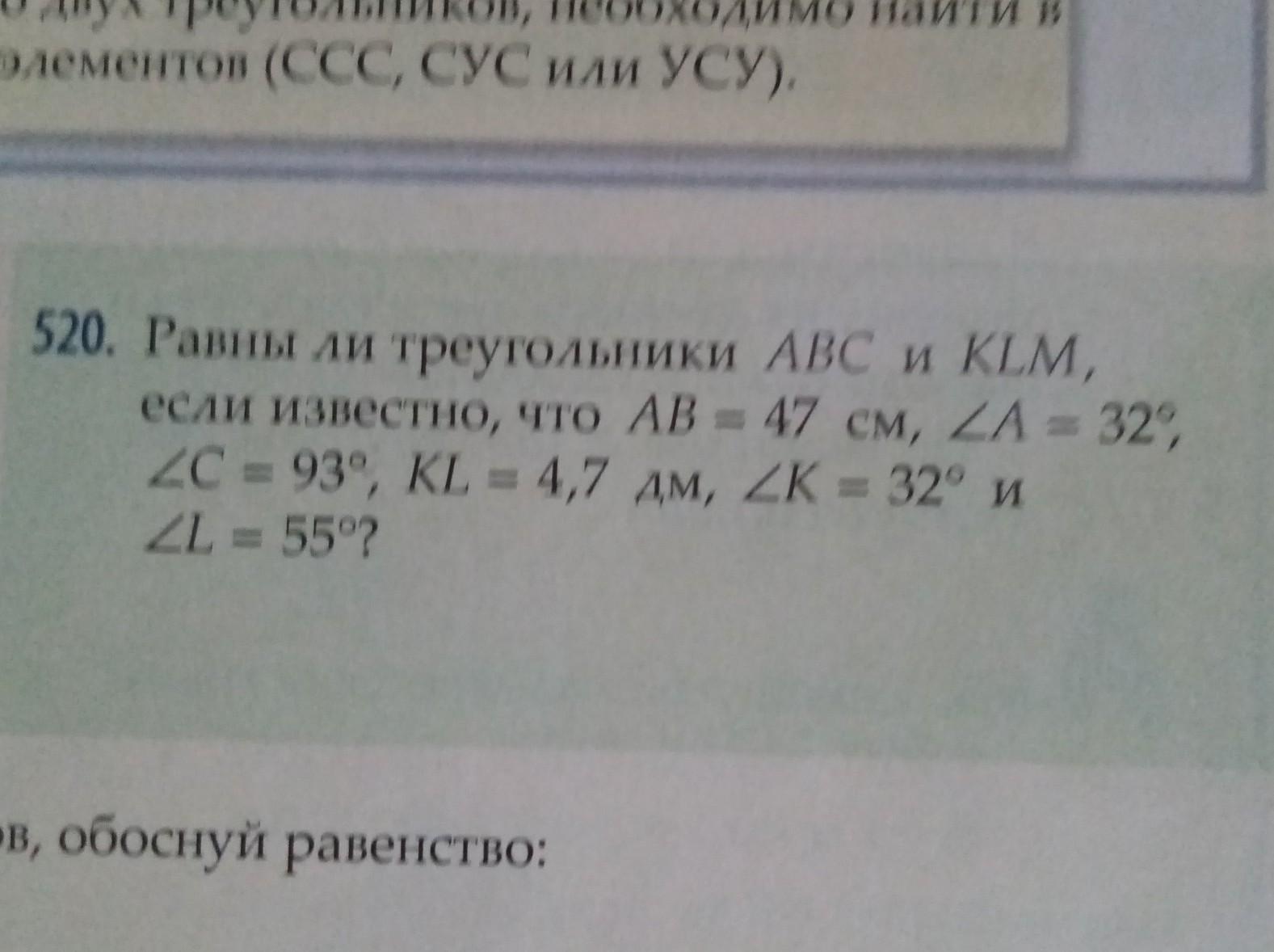 следовательно по второму признаку равенства треугольника(сторона и прилежащие к ней углы одного треугольника равны стороне и прилежащих к ней углов второго треугольника) ABC=KLM