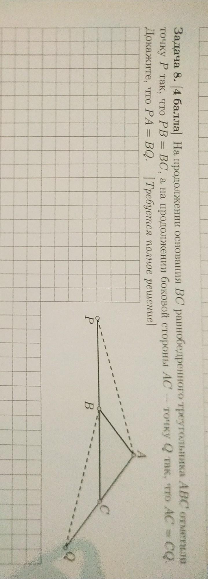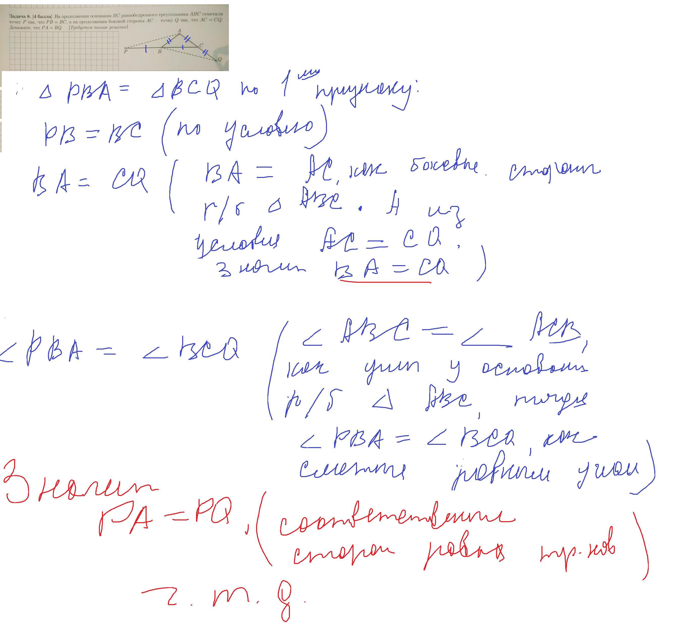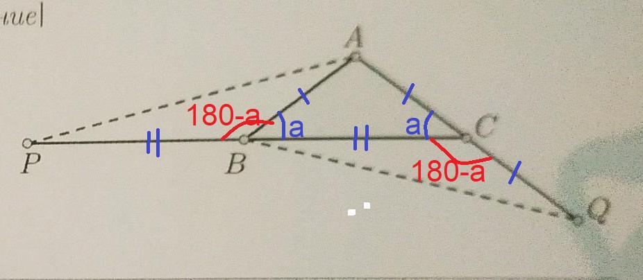 Если отметить равные стороны и углы в треугольниках АВР и BCQ, то увидим, что они равны по двум сторонам и углу.