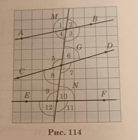По рисунку 114 назовите и выпишите всё попарно: а)соответственные углы,б) внутренние накрест лежащие углы,в)внутренние односторонние углы.