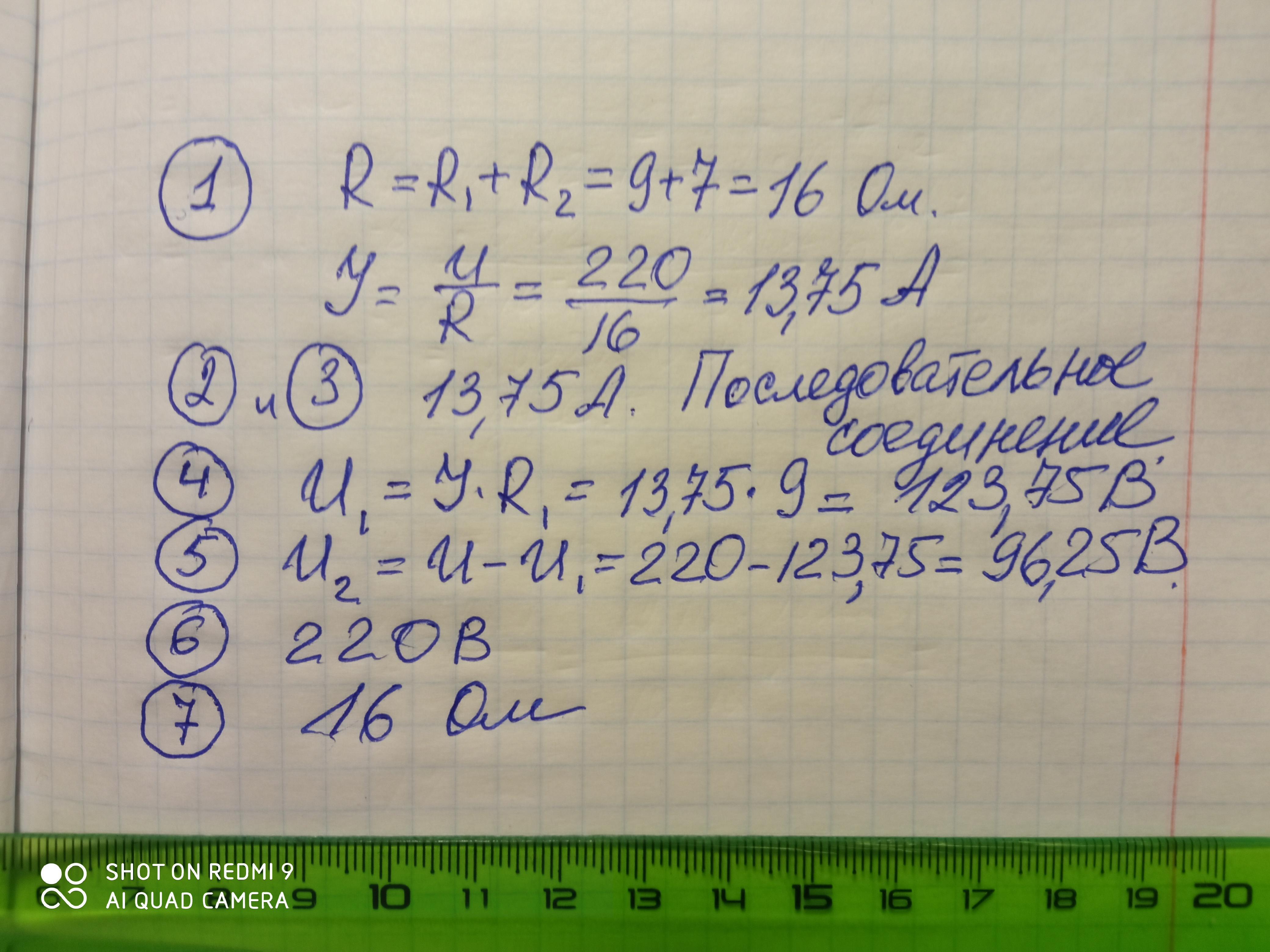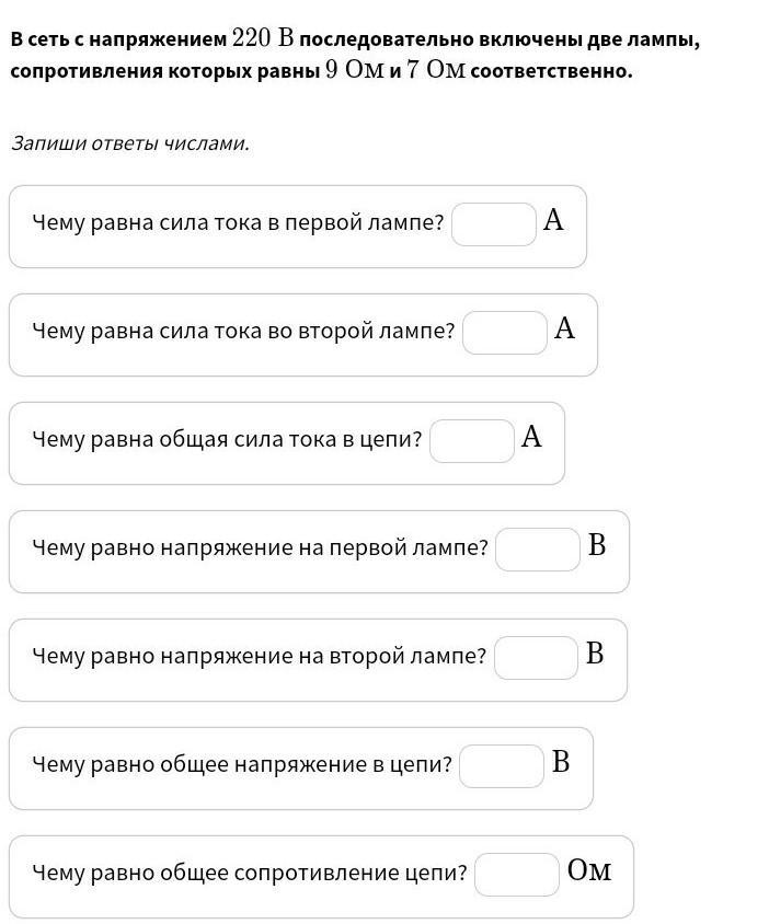 В сеть с напряжением 220\ В220 В последовательно включены две лампы, сопротивления которых равны 9\ Ом9 Ом и 7\ Ом7 Ом соответственно.