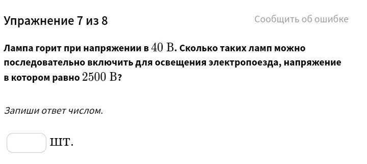Лампа горит при напряжении в 40\ В40 В. Сколько таких ламп можно последовательно включить для освещения электропоезда, напряжение в котором равно 2500\ В2500 В?