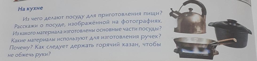 На кухне Из чего делают посуду для приготовления пищи? Расскажи о посуде, изображённой на фотографиях. Из какого материала изготовлены основные части посуды? Какие материалы используют для изготовления ручек? Почему? Как следует держать горячий казан, чтобы не обжечь руки?