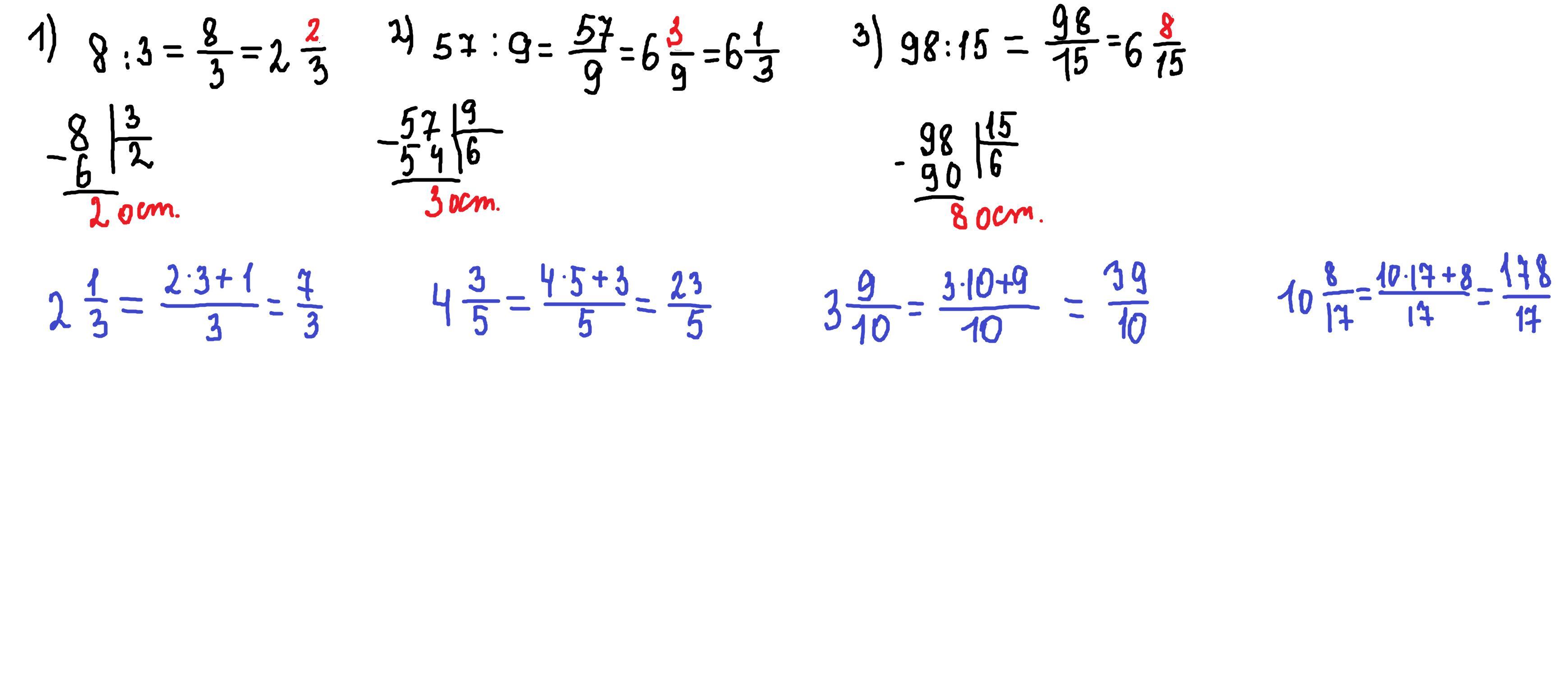 8/3=2 целые 2/3, 57/9= 6 целых 3/9, 98/15=6 целых 8/15