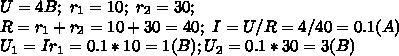 Ответ: ток в цепи 0.1А, падения напряжения на резисторах 1В и 3В соответственно.