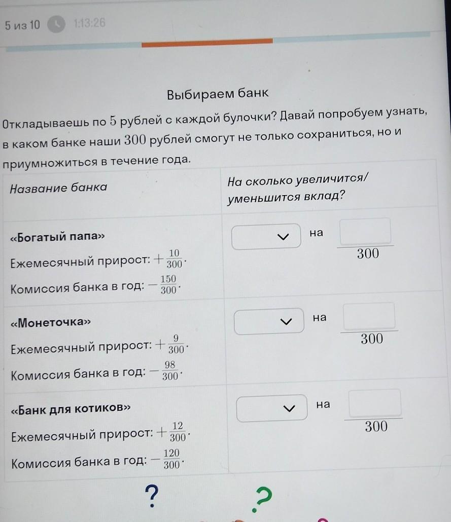 Выбираем банк: Откладываешь по 5 рублей с каждой булочки? Давай попробуем узнать, в каком банке наши 300 рублей смогут не только сохраниться, но и приумножиться в течение года. Название банка На сколько увеличится/ уменьшится вклад? «Богатый папа»