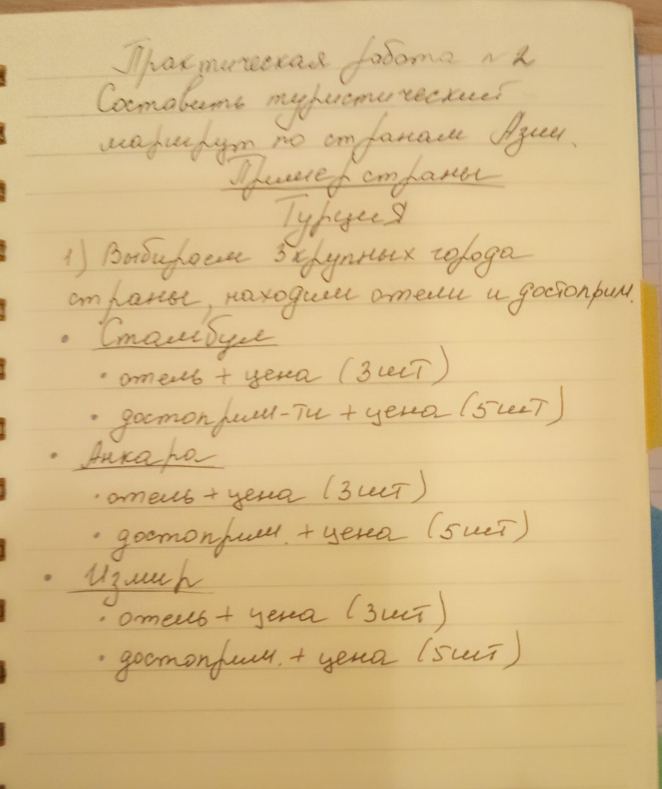 1.Выбираем 3 крупных города страны находим отели и достоприм