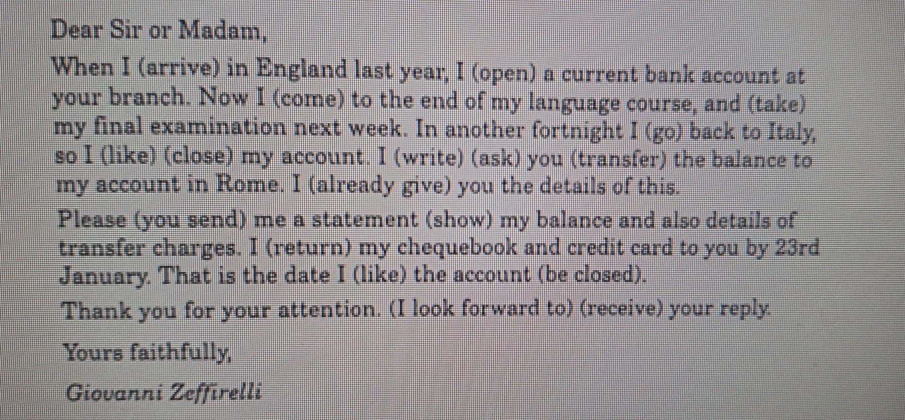 Ответ:arrived, opened, am coming to..., taking, I'm going willgwilo back, so I'd like to close.., I'm writing to ask you transferring, I've already given you..., would you send me, showing, I'll return my..., I'd like the account to be closed. I'm looking forward to receiving...