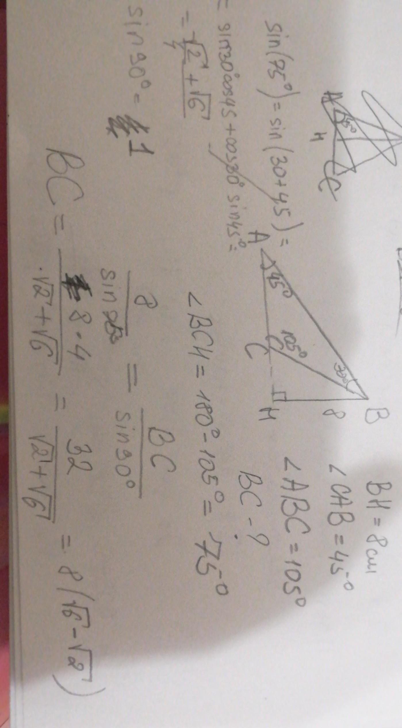 В треугольнике ABC из вершины B проведены высоты BH найдите стороны вс треугольника, если высота BH равна 8, а углы CAB и ABC равны 45* и 105* сответсвенно. Решить с рисунком ! с инета не копировать .