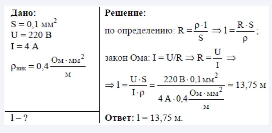 Спираль энергонагревателя изготовлен из никелиновой проволоки площадью поперечного сечения 0,1 мм в квадрате . Чему равна длина этой проволоки если при напряжении 220 В сила тока в ней 4 А?