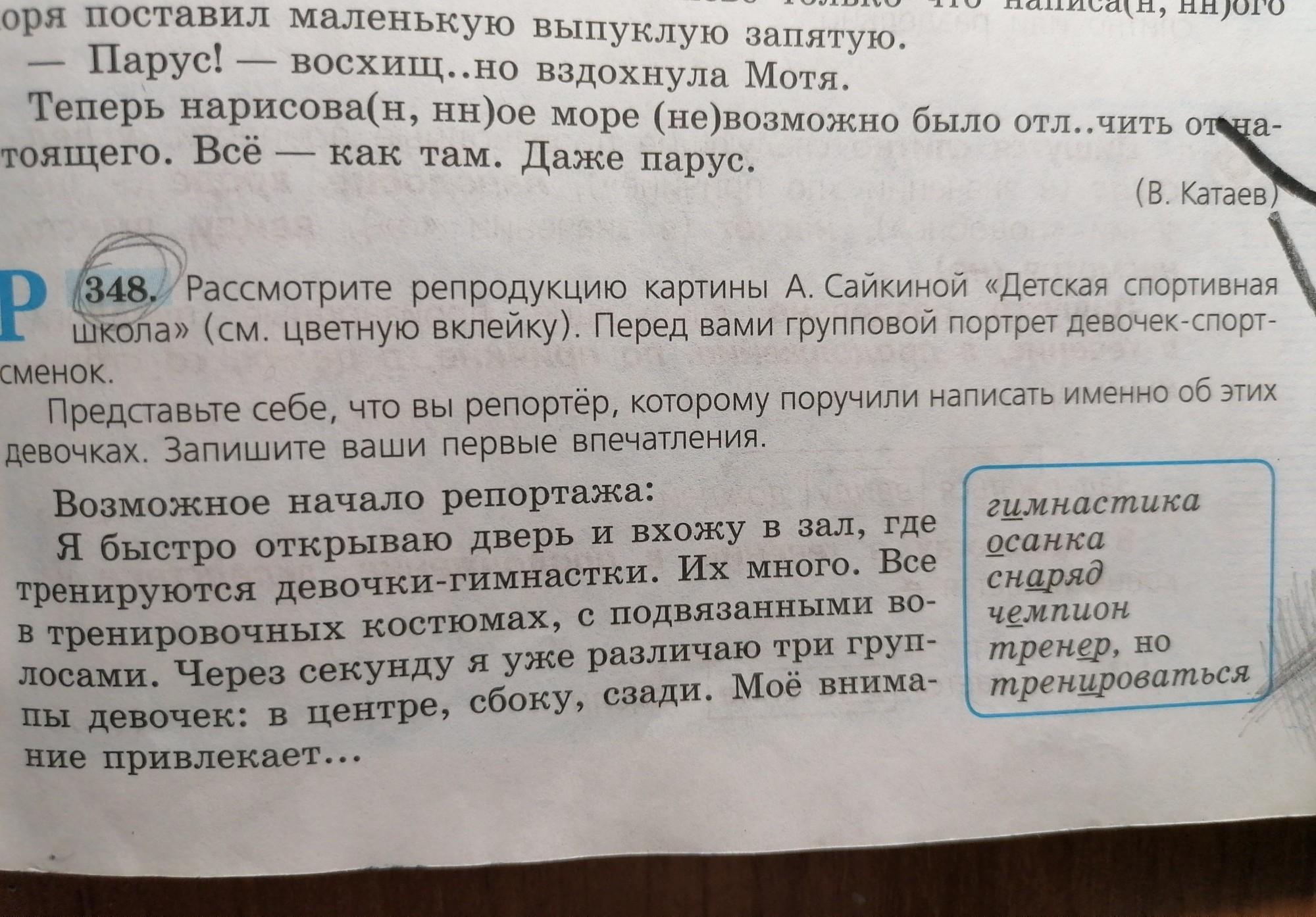 Мое внимание привлекает фигура в центре .В ярко-красном гимнастическом костюме,раскрасневшаяся после долгой тренировки, стоит юная гимнастка. По ее торжествующему виду,гордой улыбке на лице видно.что сегодня она достигла многого.Она в окружении других спортсменок, мирно отдыхающих после тренировки. Девочки с интересом наблюдают за проходящей рядом тренировкой.