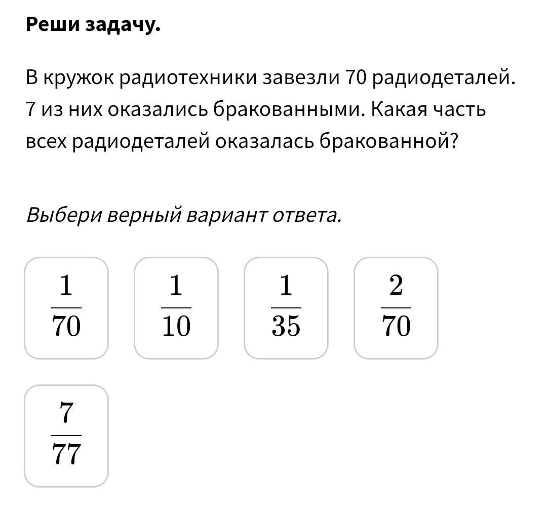 В кружок радиотехники завезли 70 радиодеталей. 7 из них оказались бракованными. Какая часть всех радиодеталей оказалась бракованной?