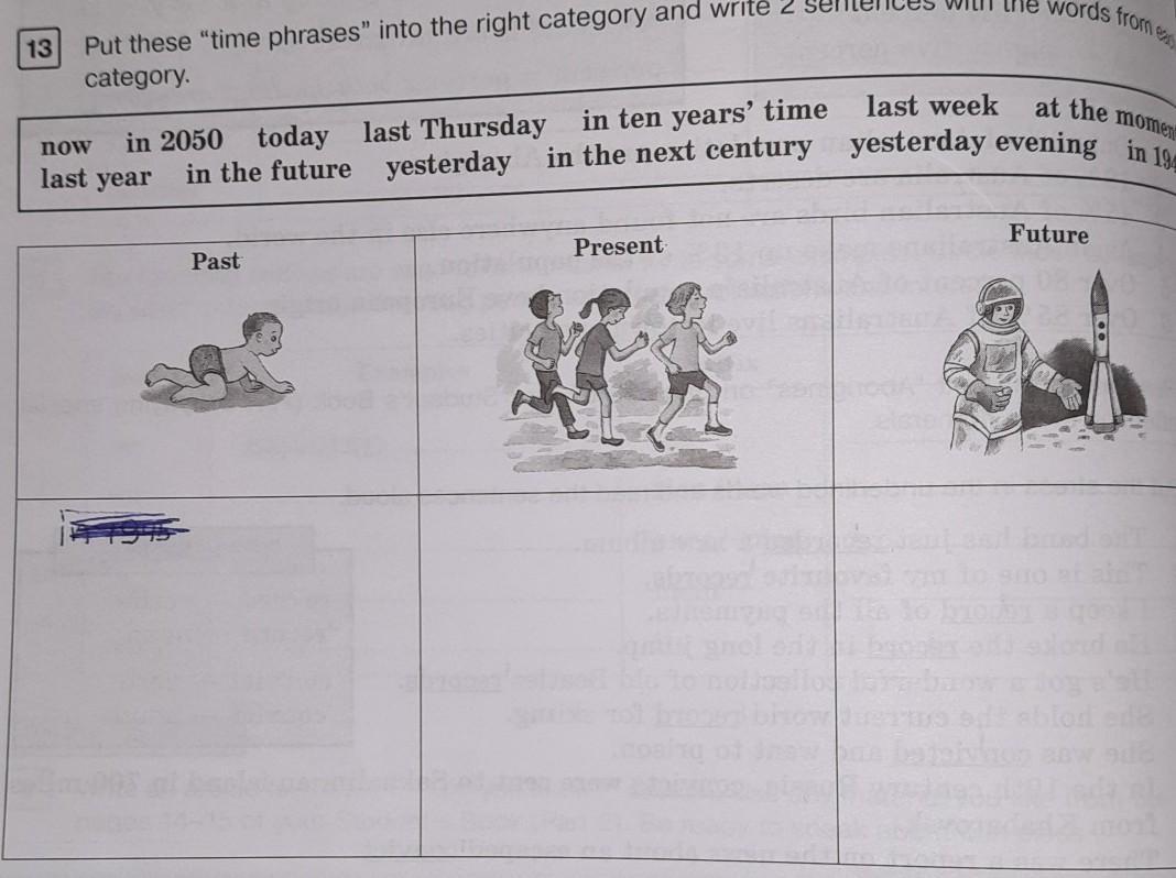 category at the moment in 1946 now in 2050 today today last Thursday in ten years' time last week in the future yesterday in the next century yesterday evening last year Future Present Past