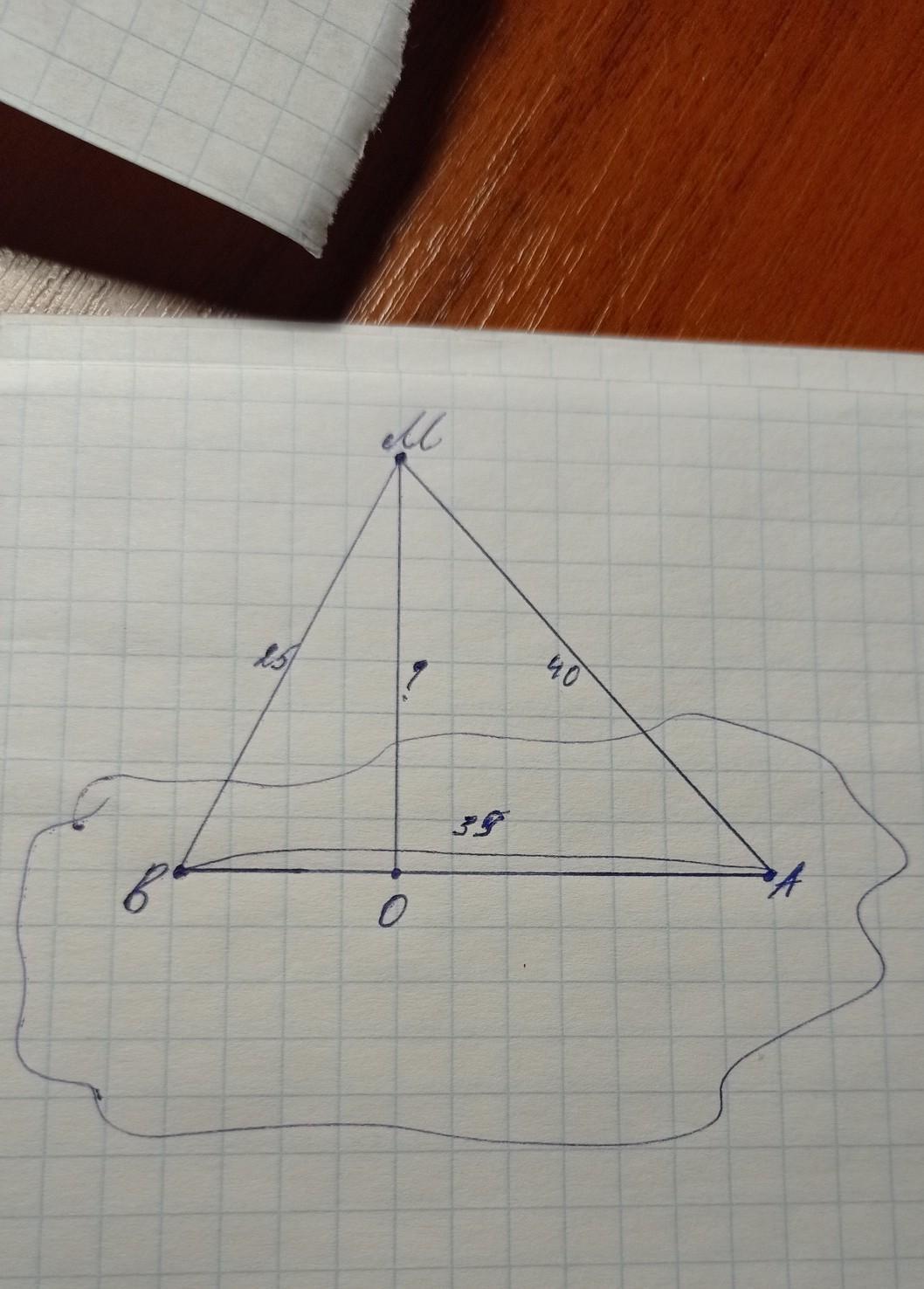 Пусть ОА=х, тогда ОВ=39-х, найдем квадрат высоты по теоереме Пифагора из двух треугольинков МОВ и МОА, получим