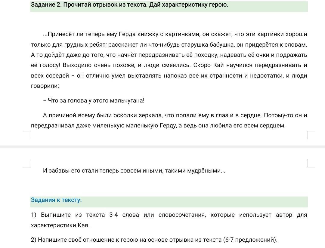 2) слова автора, которые характеризуют Кая:Принесет Герда книжку, Кай скажет, что она для грудных ребят.Передразнивал Герду, которая так его любила, и свою старушку бабушку.