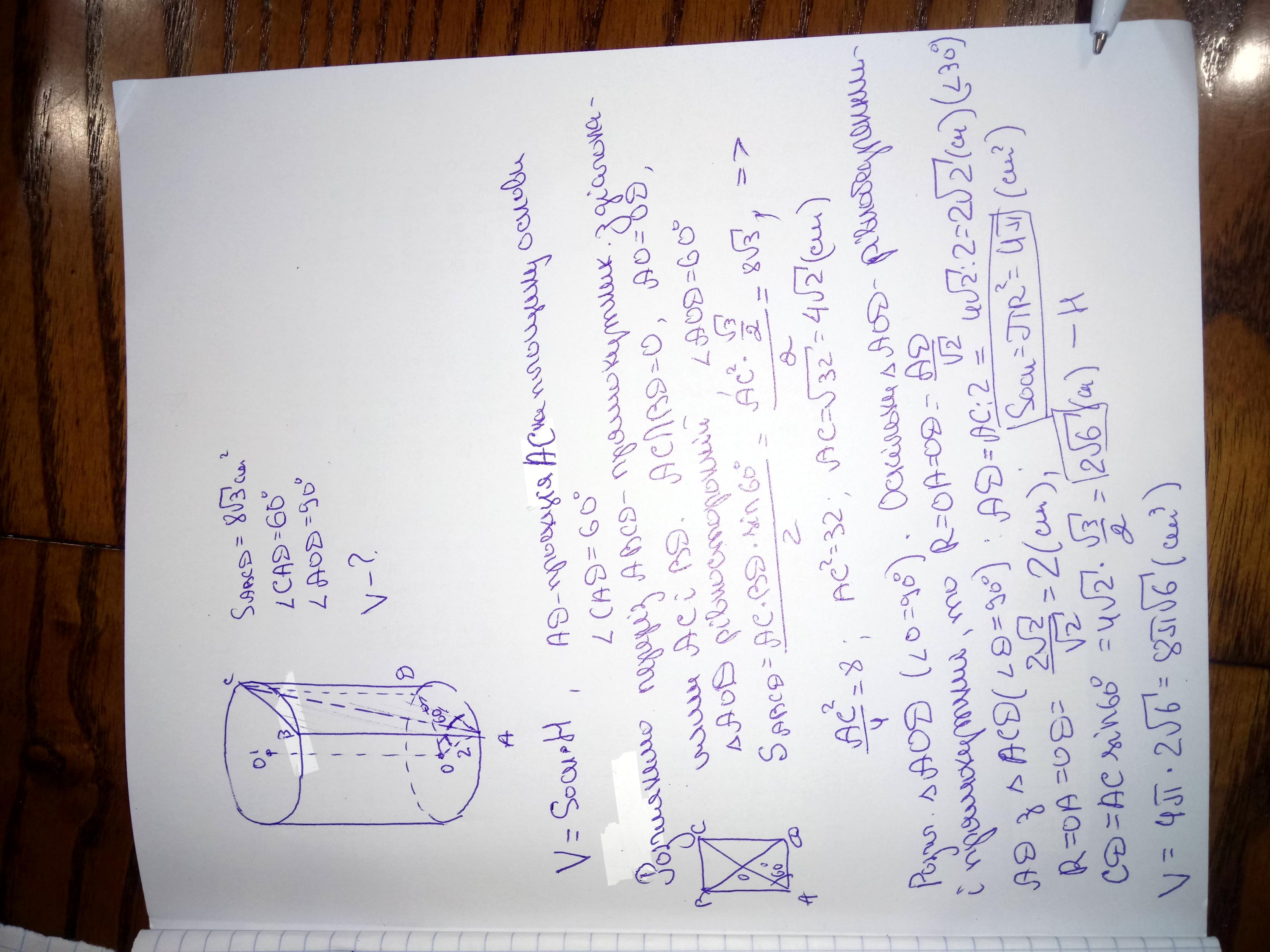 В цилиндре параллельно оси проведено сечение, пересекающее основание по хорде, которое видно ia центра этого основания под прямым углом. Образовавшаяся площадь сечения равна 8корень из 3 см, а угол наклона диагонали сечения к плоскости основания равен 60°. Найдите объем цилиндра.
