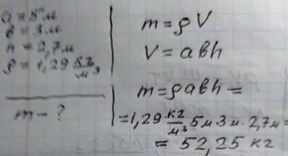 вычисли массу воздуха в комнате шириной 3 метра, длиной 5м и высотой 2,7м, считая что его плотность равна 1,29кг/^3. Ответ округли до сотых при необходимости