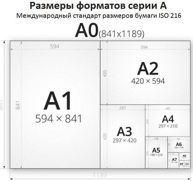 Один из самых популярных форматов - А4 - размером 210 на 297 миллиметров. Остальные форматы отличаются в 2 раза от формата с соседним номером. Чем номер больше, тем формат меньше, при этом делится пополам длинная сторона.