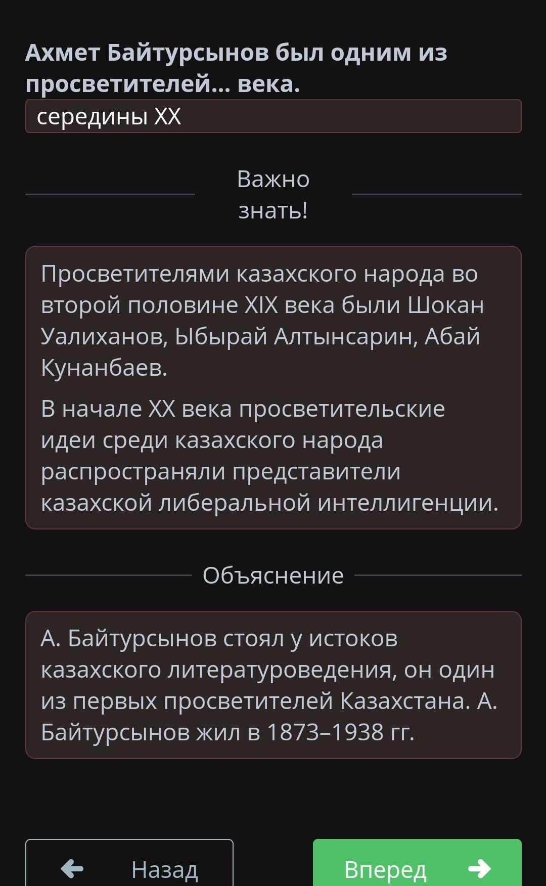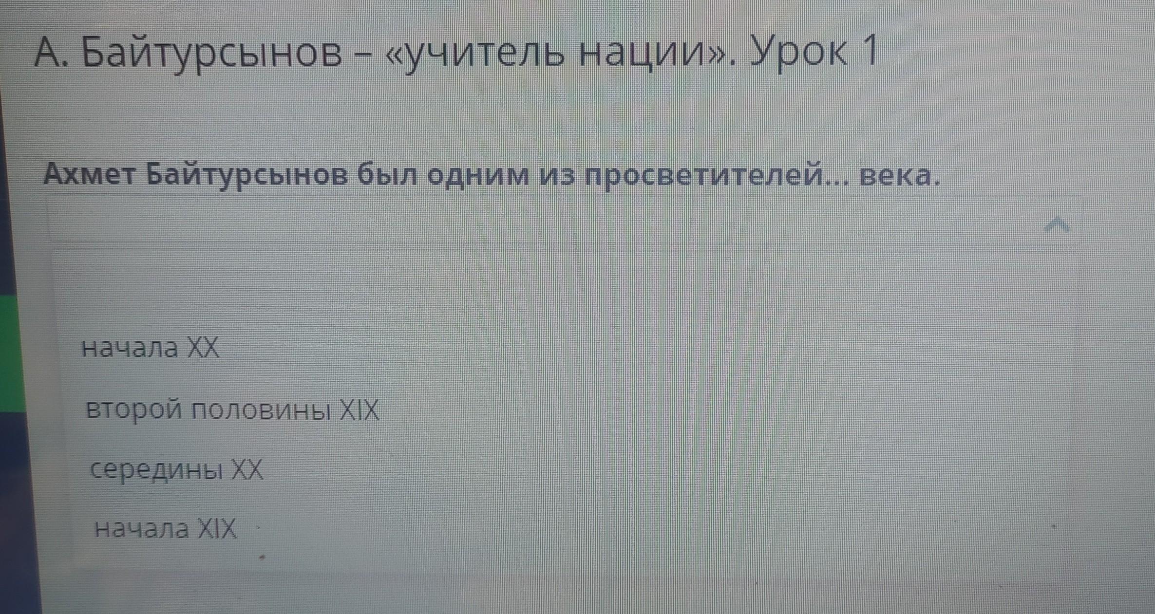 Ахмет Байтурсынов был одним из просветителей... века начала XX Второй половины XIX середины XX Havana XIN