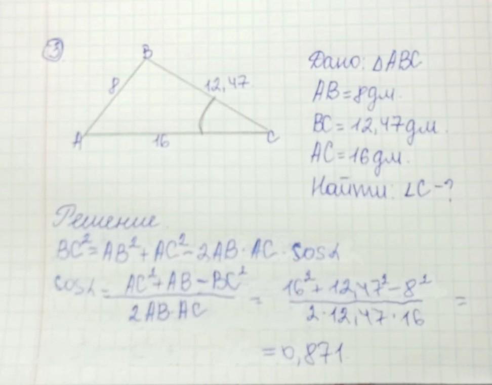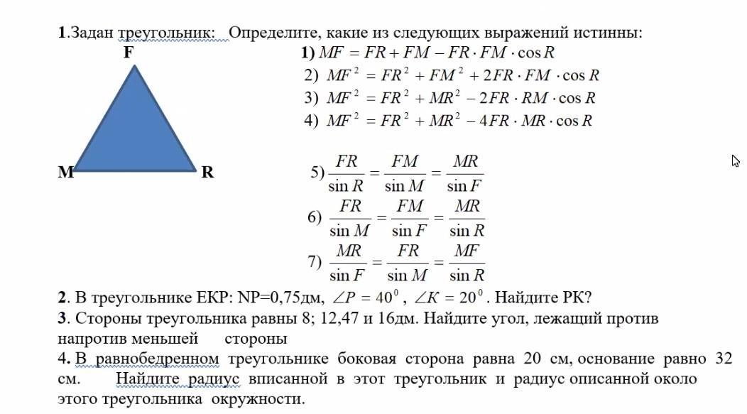 1.Задан треугольник: Определите, какие из следующих выражений истинны: F 1) MF = FR + FM - FR - FM - cos R 2) MF2 = FR2 + FM + 2 FR - FM - cos R 3) ME 2 = FR + MIR2 — 2 FR - RM - cos R 4) ME = FR + MR — 4FR - MR - cos R + ДЕ FR M MR R 5) sin R. sin M sin F FR FM MR 6) sin M. sin F si R MR FR 7) sin F sin M sin R 2. В треугольнике EKP: NP=0,75 дм, LP = 40°, 2K = 20" . Найдите РК? 3. Стороны треугольника равны 8: 12,47 и 16дм. Найдите угол, лежащий против напротив меньшей стороны 4. В равнобедренном треугольнике боковая сторона равна 20 см, основание равно 32 Найдите радіус вписанной в этот треугольник и радиус описанной около этого треугольника окружности. СМ.