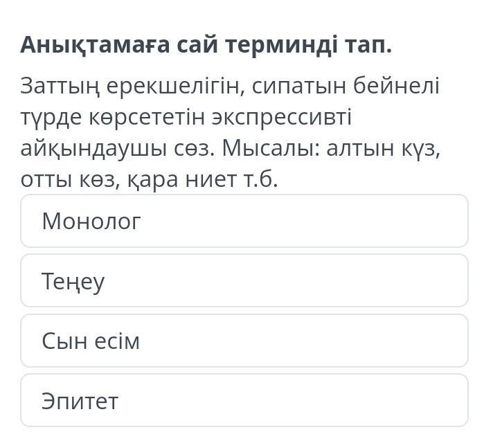 Анықтамаға сай терминді тап. Заттың ерекшелігін, сипатын бейнелі түрде көрсететін экспрессивті айқындаушы сөз. Мысалы: алтын күз, опты көз, қара ниет т.б. Монолог Теңеу Сын есім Эпитет