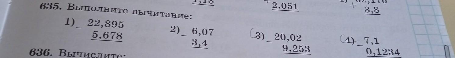 635. Выполните вычитание: 1) 22,895 2) 6,07 5,678 3,4 (3) 20,02 9,253 (4 7,1 0,1234 -