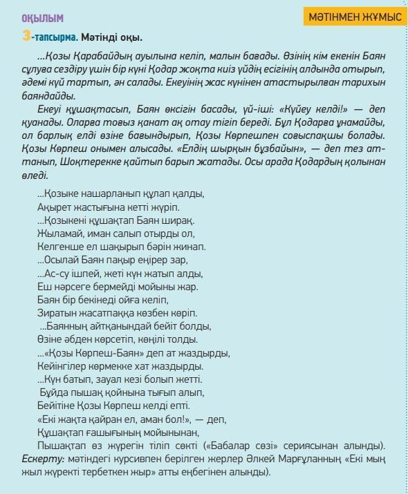 7-Тапсырма. «қозы көрпеш-баян сұлу» мультфильмін көріңдер. 3-тапсырмадағы мәтін мен мультфильмнің желісін салыстырыңдар. қандай ұқсастық пен айырмашылық бар екенін айтыңдар.