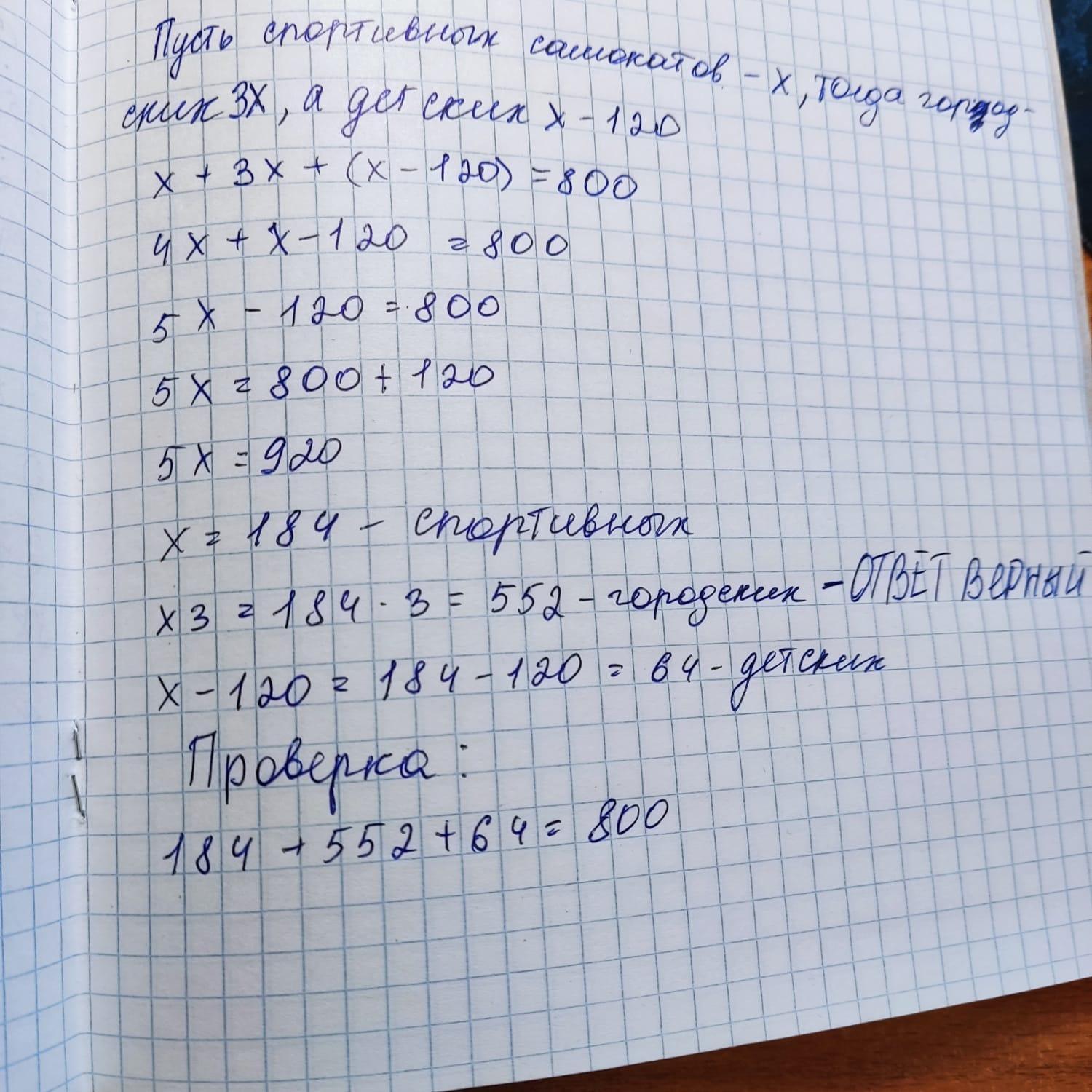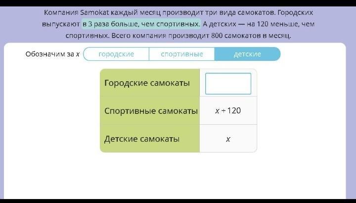 Компания Samokat каждый месяц производит три вида самокатов. Городских выпускают в 3 раза больше, чем спортивных. А детских — на 120 меньше, чем спортивных. Всего компания производит 800 самокатов в месяц. СКОЛЬКО НАДО НАПИСАТЬ ГОРОДСКИХ ТАМ НЕ 552