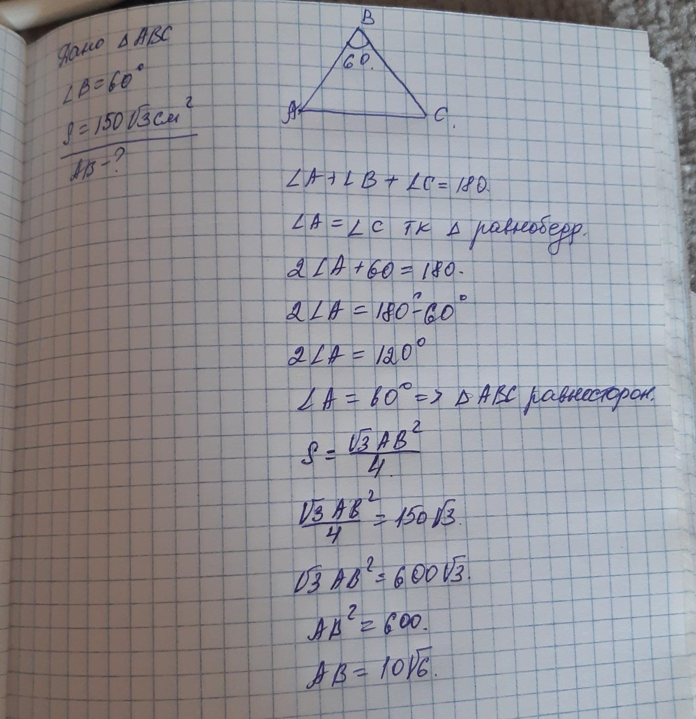 Кут при вершині рівнобедреного трикутника дорівнюе 60°,а його площа — 150√3 см². Знайдіть бічну сторону трикутника