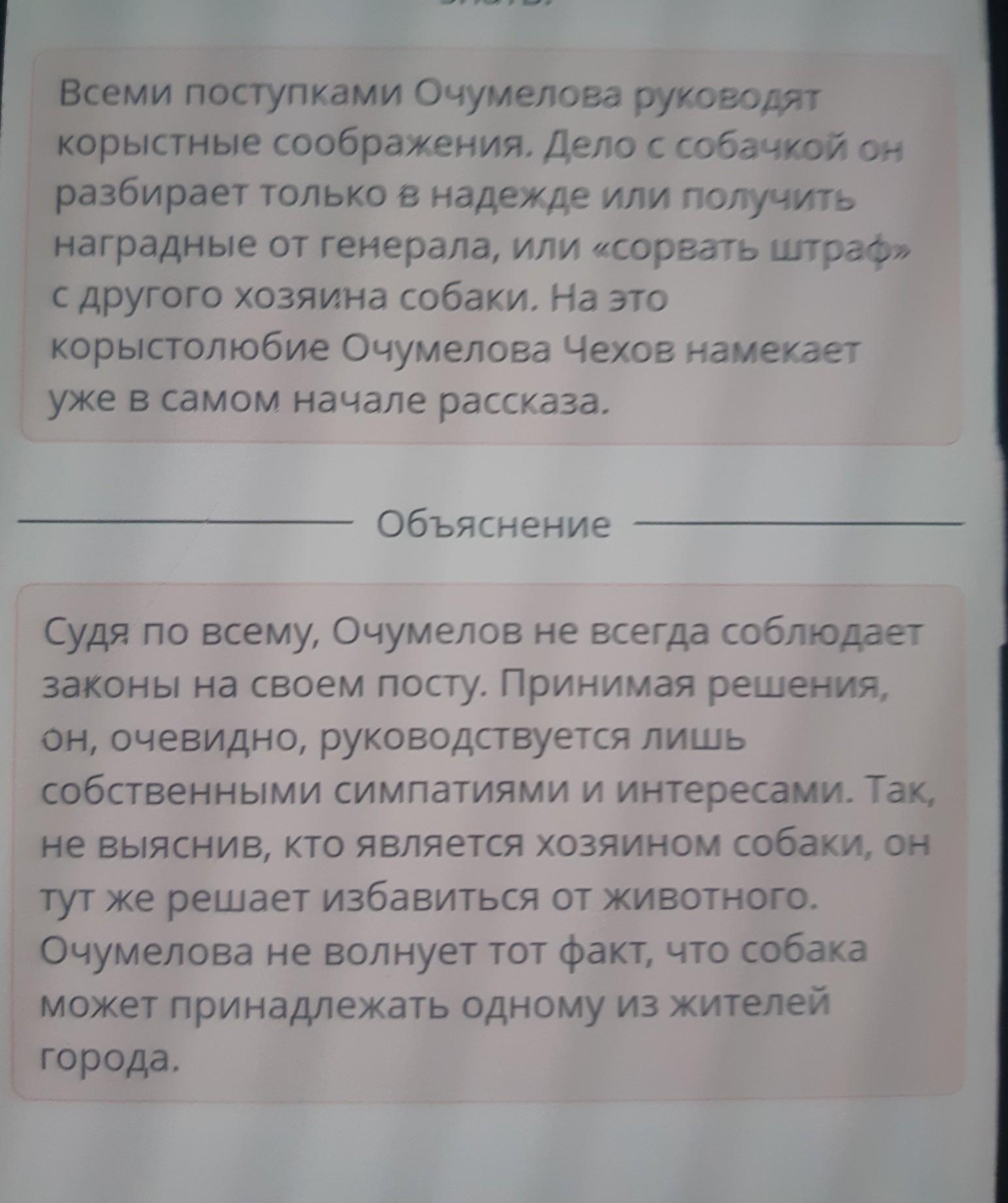Анализ эпизодов рассказа А.П. Чехова «Хамелеон» Определи, какой из фрагментов рассказа указывает, что Очумелов не всегда соблюдает законы на своем посту и принимает решения, руководствуясь лишь собственными симпатиями и интересами.
