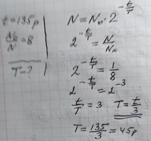Визначте період піврозпаду радіоактивного елемента (у роках), якщо за 135 років його активність зменшилась у 8 разів.