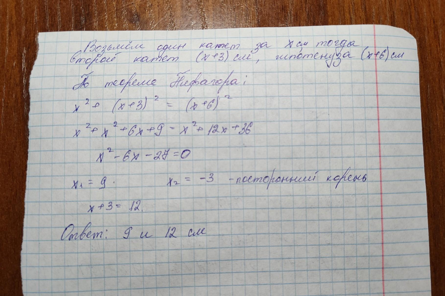 №6. В прямоугольном треугольнике один из катетов на 3см меньше второго и на 6 см меньше гипотенузы. Найдите катеты треугольника. СРОЧНО ПОМОГИТЕ
