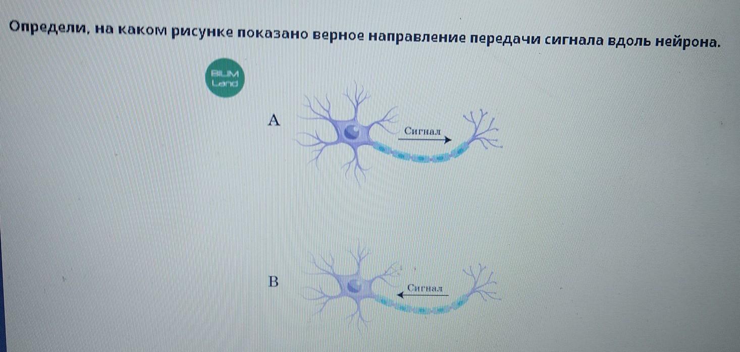 Определи, на каком рисунке показано верное направление передачи сигнала вдоль нейрона. BILIM Land A Сигнал B