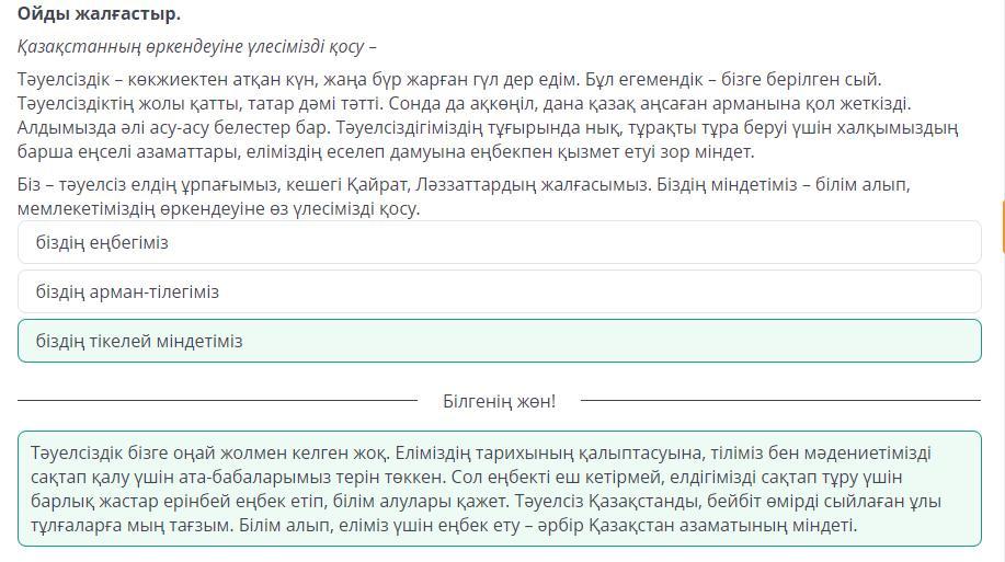 өркендеуіне үлесімізді қосу - Тәуелсіздік - көкжиектен атқан күн, жаңа бүр жарған гүл дер едім. Бұл егемендік – бізге берілген сый. Тауелсіздіктің жолы қатты, татар дәмі тәтті. Сонда да ақкөңіл, дана қазақ аңсаған арманына қол жеткізді. Алдымызда әлі асу-асу белестер бар. Тәуелсіздігіміздің тұғырында нық, тұрақты тұра беруі үшін халқымы барша еңселі азаматтары, еліміздің еселеп дамуына еңбекпен қызмет етуі зор міндет. Біз - тәуелсіз елдің ұрпағымыз, кешегі Қайрат, Ләззаттардың жалғасымыз. Біздің міндетіміз – білім алып, мемлекетіміздің өркендеуіне өз үлесімізді қосу. біздің тікелей міндетіміз біздің арман-тілеріміз бодің еңбегіміз